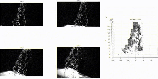 在典型無紋理透明非剛體高速水射流三維形態重建案例中,中科君達視界工程師們使用4臺千眼狼高速攝像機同步捕捉水柱表面毛細波、初始破碎點及液滴飛濺,并采用SMART技術成功重建出水柱主體及其邊緣破碎產生的液滴三維結構。