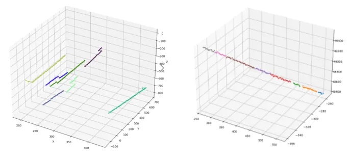 在一項針對數百個快速移動黑色小球進行拋落實驗追蹤驗證中,由于黑色小球表面顏色單一缺乏明顯紋理特征,屬于典型低特征場景,通過空間聚類MOT的幾何重建技術,獲取了黑色小球準確的位置信息,利用2D投影剔除一對多誤匹配方法,提高了軌跡的唯一性和準確性,再進一步通過對軌跡進行擬合分析識別并修正錯誤軌跡連接,增強跟蹤結果的穩定性和可靠性。